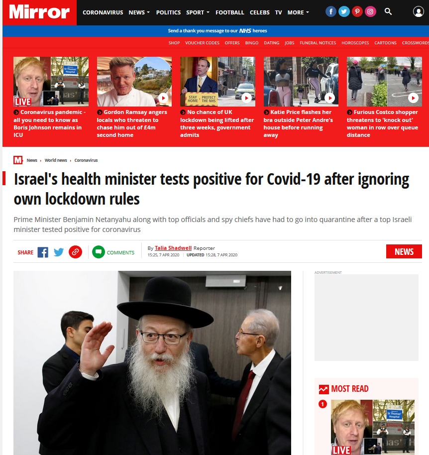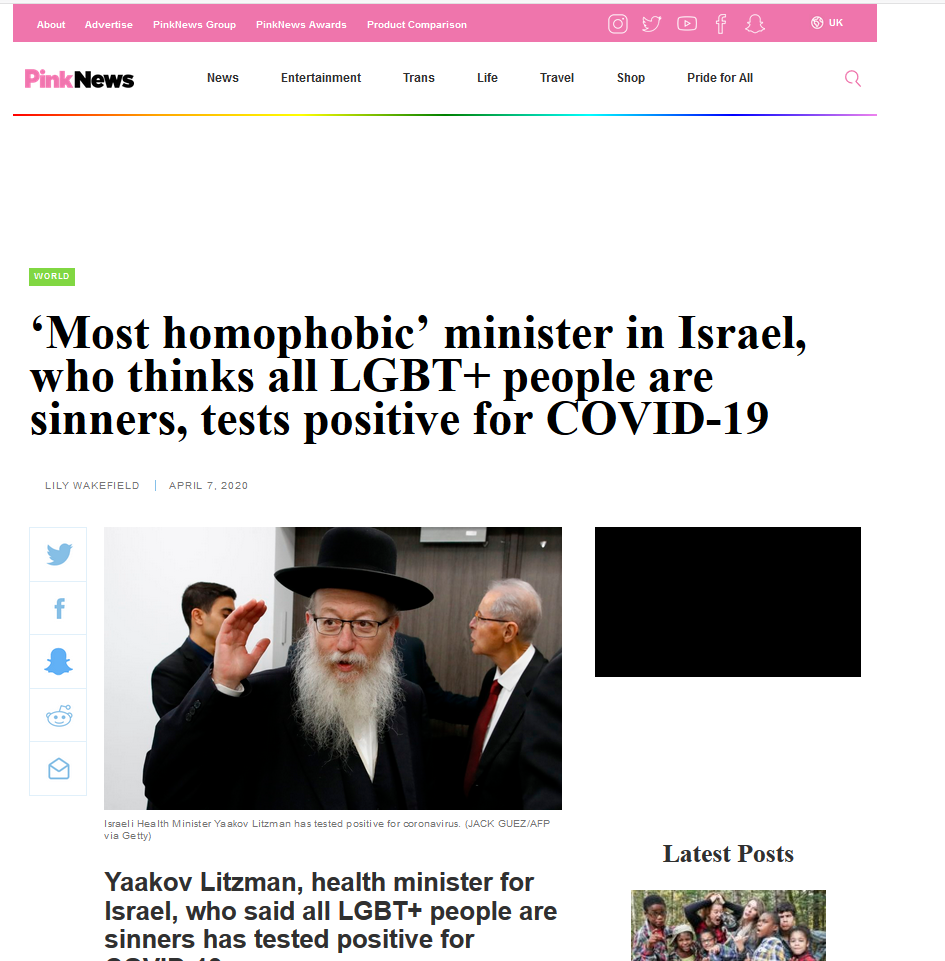 „Израелскиот министер за здравство Јаков Лицман кој пред неколку недели коронавирусот го нарече „господова казна против хомосексуалците“ е позитивен на Ковид-19“,